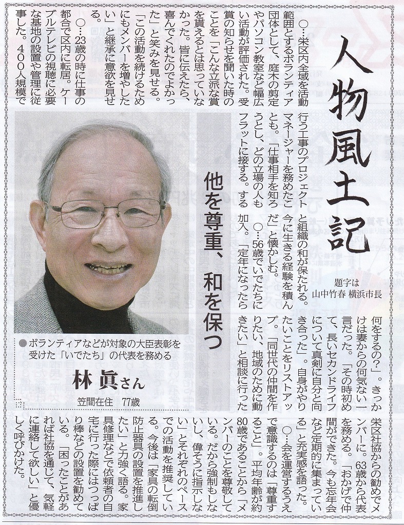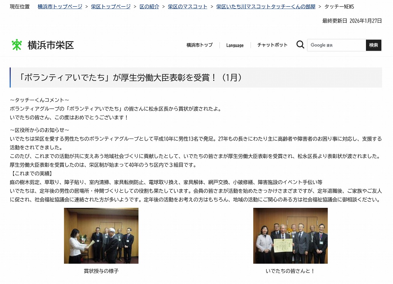 ・2026年1月22日 タウンニュース ; 栄区ボラ団体「いでたち」が大臣賞 高齢者支援などが評価