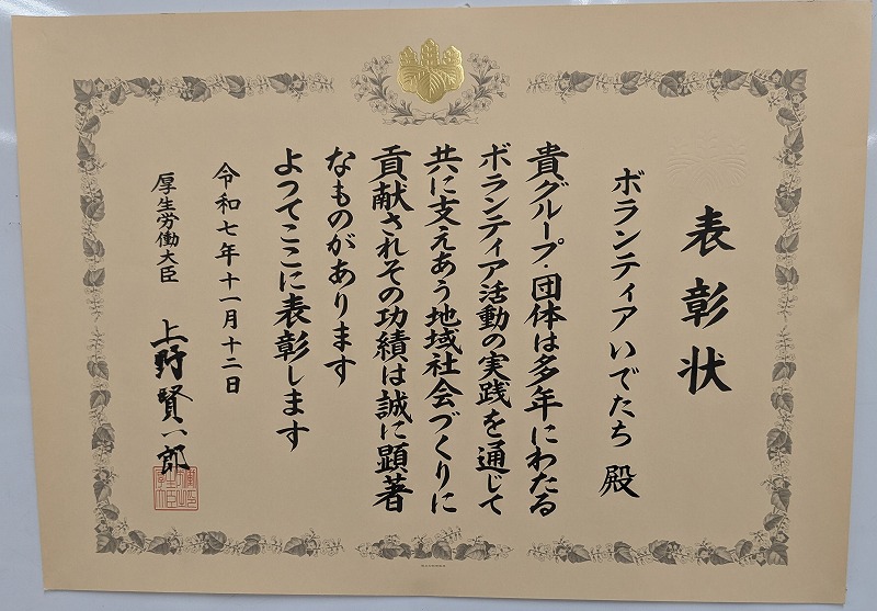 ボランティア「いでたち」は2025年11月12日に「令和7年度厚生労働大臣表彰のボランティア功労賞」受賞しました。