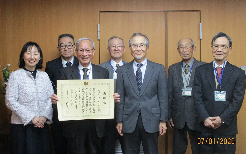 眞さんに表彰状と記念品を渡した渡辺巧教副市長からは、“男性ボランティアである皆さんの受賞が、男女共同参画と地域活動の今後のあり方として参考となり、大変はげみになりました”、